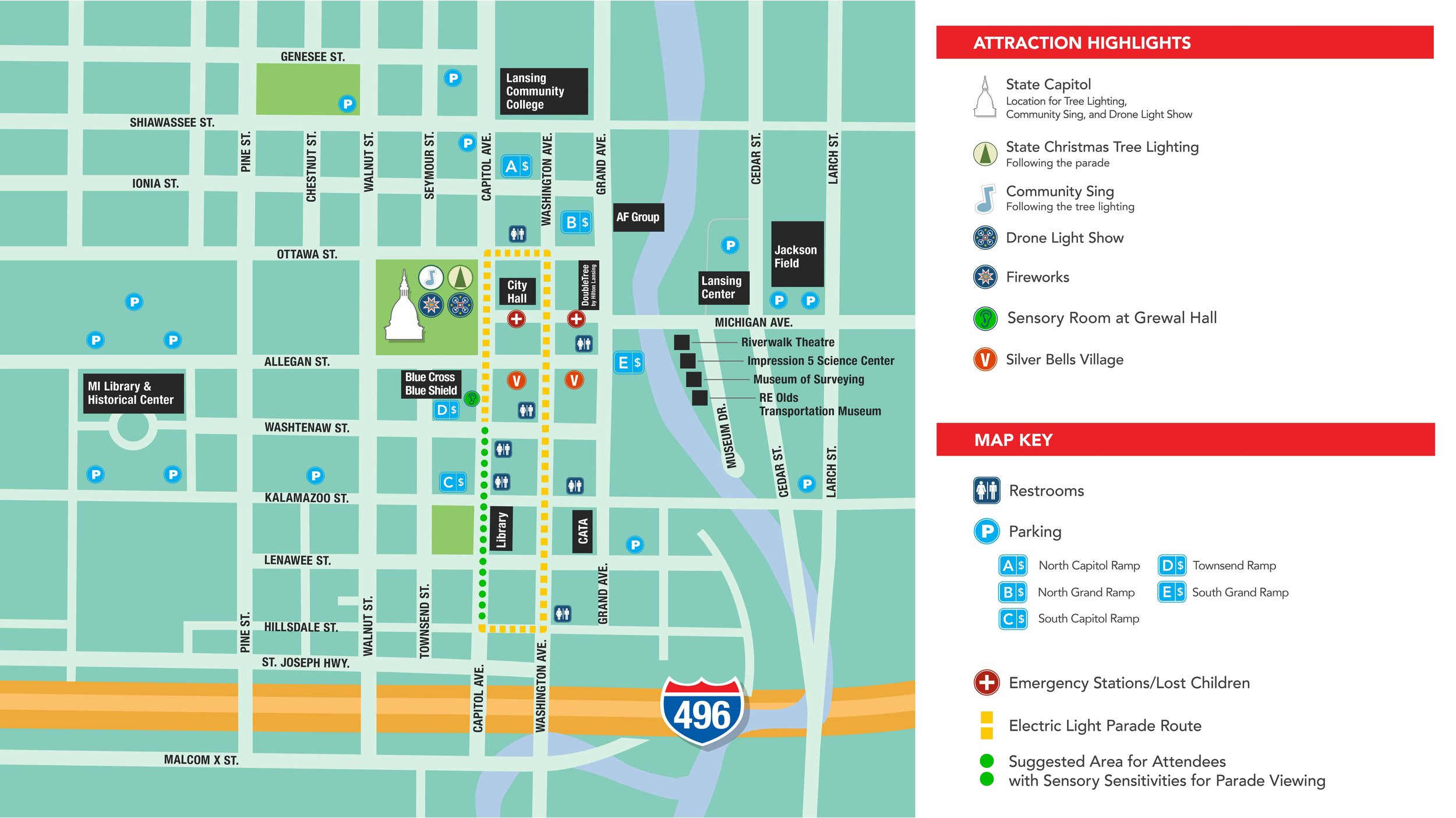 2. Headphones, earplugs, fidget spinners, sunglasses and sensory maps will be available, while supplies last, for those who may need them. These items will be available in Silver Bells Village at the Mid-Michigan Autism Association booth. The Village is located on the 100 block of E. Allegan Street between South Washington Square and Grand Avenue.